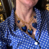 A Vintage style necklace featuring strawberries in gold plated metal and decorated with red enamel. Made in the UK.